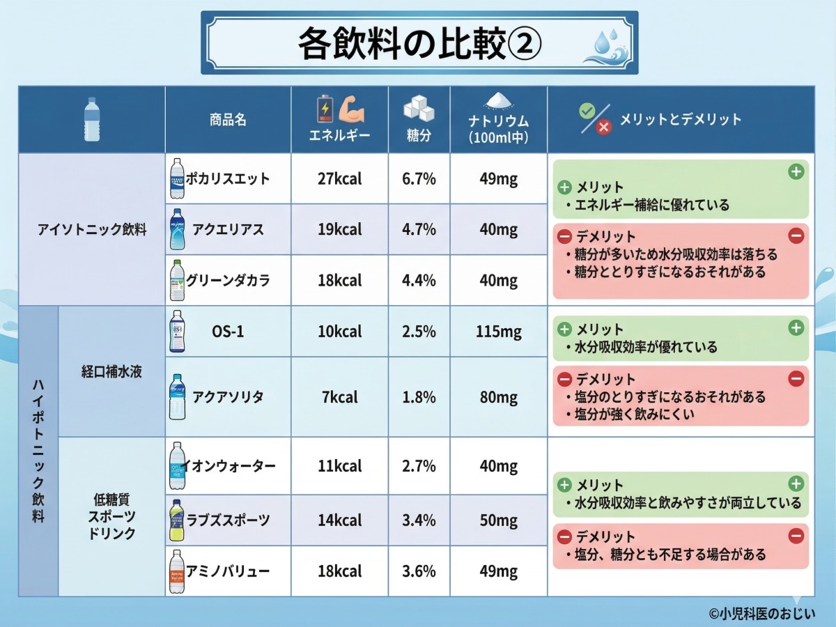 スポーツドリンクと比べると、塩分が多く糖分が少ないんじゃ。